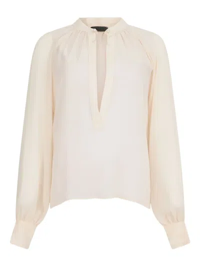 long sleeves | transparent effect V-neckline | Pleated design | white shirt | Sheer fabric | bow on collar | charm detail on collar | Button detail | Keyhole detail | buttons on cuffs