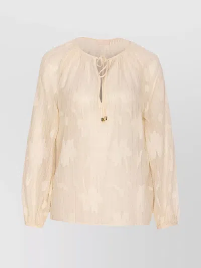 long sleeves | v-neck with laces closure | transparent effect | Sheer fabric | beige shirt | Tie detail | Floral pattern | Gold-tone hardware | button on cuffs
