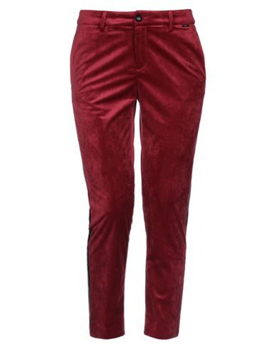 velvet, coated fabric, logo, side seam stripes, solid color, mid rise, regular fit, tapered leg, button, zip, multipockets , Color: Burgundy , Size: 12