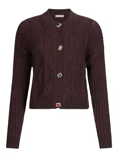 brown cable knit v-neck jewel button closure wool blend ribbed texture