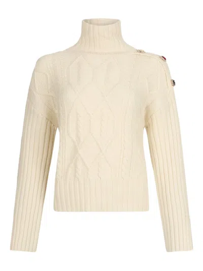 The Liu Jo Maglie Naturale sweater combines comfort and style with a luxurious wool blend. A high turtleneck enhances its chic appeal, while detailed cable knit patterns showcase artisanal craftsmanship. Long ribbed sleeves with thumb holes offer a cozy silhouette, and decorative buttons on one shoulder add a unique touch. Its slightly cropped fit and ribbed hem make it a versatile choice for casual or sophisticated occasions. Wool blend material High turtleneck Cable knit patterns Long ribbed sleeves with thumb holes Decorative buttons on one shoulder Slightly cropped fit Ribbed hem