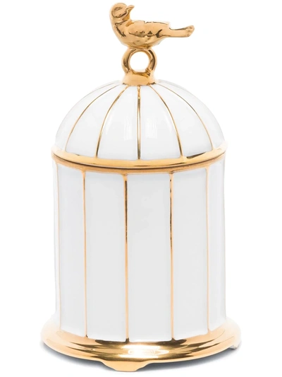 Birdcage single-wick candle from L’Objet featuring Limoges porcelain case with 24ct gold details and single-wick design.