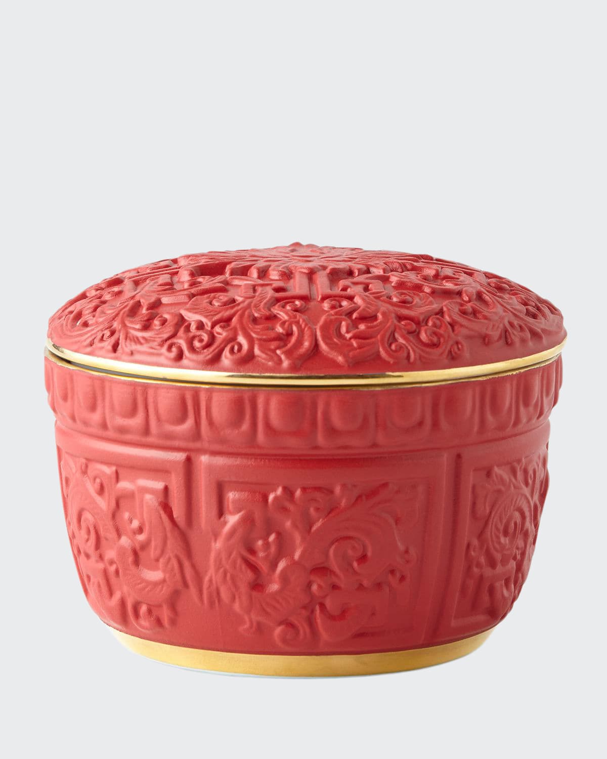 Container made of Limoges porcelain. Hand-gilded 24-kt. gold accents. Scent: Vetiver D'Orient. 4.5"Dia. x 3.5"T; burn time, approximately 35 hours. Made in Portugal.