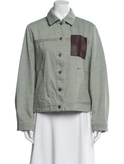 Loewe Denim Jacket By JW Anderson Brown & Green Leather Trim Embellishment & Pointed Collar Patch Pockets & Button Closure Fit: Jackets by Loewe typically fit true to size. | Loewe Denim Jacket in Brown/Green, Women's US6, FR38 | M