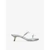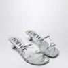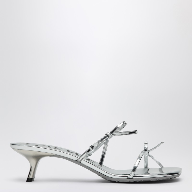 Elevate your footwear collection with the exquisite Petal Sandal in metallic silver. Crafted from luxurious calfskin, this sandal features a sleek stiletto heel and a gracefully designed petal-shaped toe, promising both elegance and comfort. With its rubber sole adorned with an embossed logo, this piece is perfect for those who appreciate refined style. Luxurious silver metallic calfskin for a sophisticated look Glossy lacquered stiletto heel for added height and elegance Unique petal-shaped toe design that exudes femininity Durable rubber sole with embossed logo for a touch of exclusivity | Loewe Women's Petal Sandal In Metallic Silver | Size 40 | LPET465X04LE