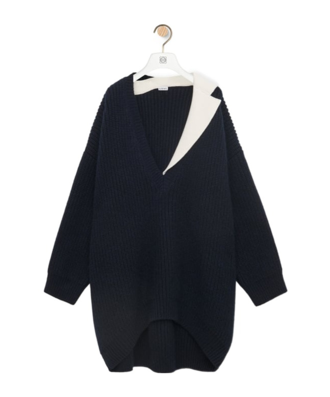Navy blue, white, V-collar, small lapel on one side, long sleeves.