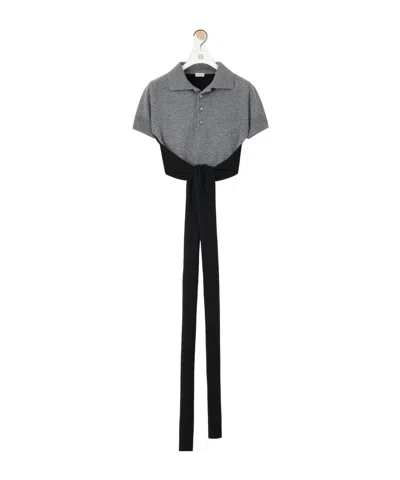 Loewe's Spring '25 collection explores dynamic, off-beat silhouettes, "moving sideways and away from the body, like falling in and out of a dream." This wool-blend polo shirt has a classic collar and long, contrasting ties that dangle from the cropped hem. The open back adds plenty of drama.- For Women.