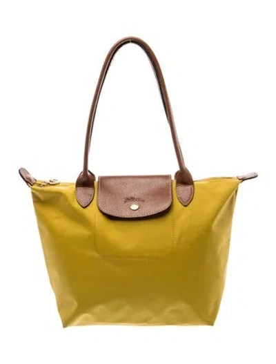 Longchamp Top Handle Bag Brown & Yellow Nylon Gold-Tone Hardware Leather Trim Flat Handles & Dual Shoulder Straps Leather & Embroidered Accents Nylon Lining & Single Interior Pocket Zip Closure at Top & Snap Closure at Front | Longchamp Nylon Top Handle Bag in Brown/Yellow