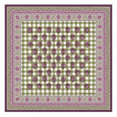 Longchamp Ladies Scarves. Fashion category: Scarves. SKU: 50651GSOM04. Color: Artichoke. Size: 19.7 in (L) x 19.7 in (H). Longchamp The Bucolic Escapade Silk Scarf. This scarf features a repeated floral motif set against a classic gingham ground, framed by a decorative border, creating a refined square accessory that can be artfully styled in multiple ways or used to add an elegant flourish to a handbag. 100% Silk.