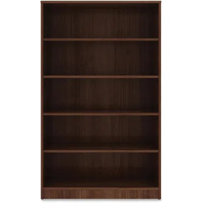 Sturdy, five-shelf bookcase offers high-quality laminate construction and a contemporary design. Shelves are 3/4" thick and made of 18mm thick, medium-density fiberboard with thermally fused, Walnut laminate for long-lasting use. The visible, one-piece backing behind the shelves is made with 3mm thick, medium-density fiberboard and matching laminate. Both sides are finished. Bookcase features four adjustable shelves, one fixed bottom shelf, square edges and adjustable feet. Each shelf holds up to 75 lb.