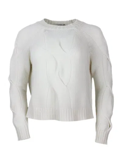 Crew-neck sweater made of soft and fine cashmere with wide braid on the front and sleeves