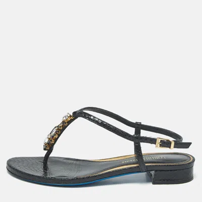 Pre-owned Black Python Embossed Leather Crystal Embellish Thong Flats Sandals Size 38.5