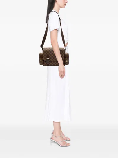 damier ebene canvas body with leather trim adjustable flat strap front flap with buckle closures exterior side zip pockets interior slip pockets brown Serial Number: MI0096 Inclusions: dust bag. Condition: GOOD. This previously owned and used item is in good condition with minimal signs of use. This may include fading of material or plating and scratches. Please refer to the photos on this product page for a detailed view of the item, including any damages declared.