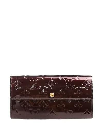 circa 2012 dark purple debossed monogram pattern patent finish foldover top press-stud fastening internal logo stamp internal card slots internal zip-fastening pocket internal slip pocket Condition: GOOD. This previously owned and used item is in good condition with minimal signs of use. This may include fading of material or plating and scratches.