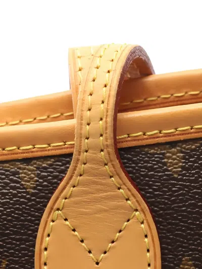 brown monogram leather handles pouch yellow striped lining interior zip pocket Condition: EXCELLENT. This previously owned item is in near-perfect condition with no signs of damage or use.