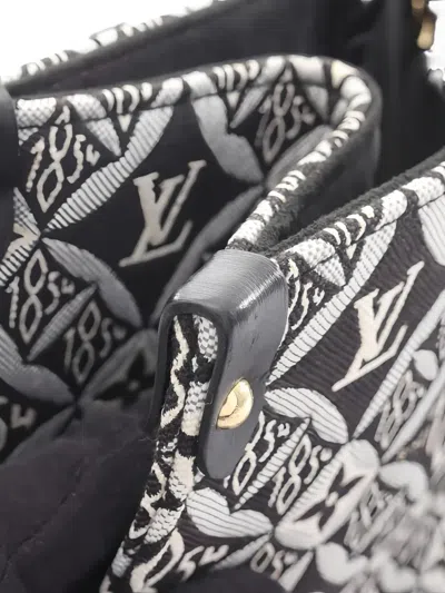 gray and black monogram jacquard leather trim top handles internal zip pocket gold-tone hardware 2-way Condition: EXCELLENT. This previously owned item is in near-perfect condition with no signs of damage or use.