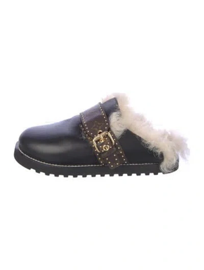 Louis Vuitton Leather Mules Black & Brown LV Monogram Leather Trim Studded & Fur Accents Round-Toes Mary Jane Strap Size not listed, estimated from measurements. Designer Fit: Flats by Louis Vuitton typically run a half size to a full size small. Unfortunately, due to restrictions, this item may not be eligible for shipping in all areas. | Louis Vuitton LV Monogram Leather Mules in Black/Brown, Women's 9.5