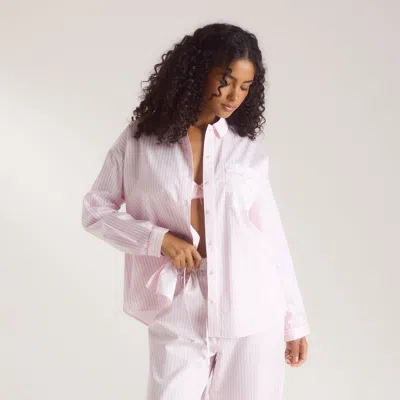 Collared pyjama shirt Striped cotton fabric Pocket to front in contrast floral print with piping and picot edge detail Back yoke liner in contrast floral print Embroidered 'L' lettermark to front pocket Narrow cuffs with single button detail Piping detail to cuff seams