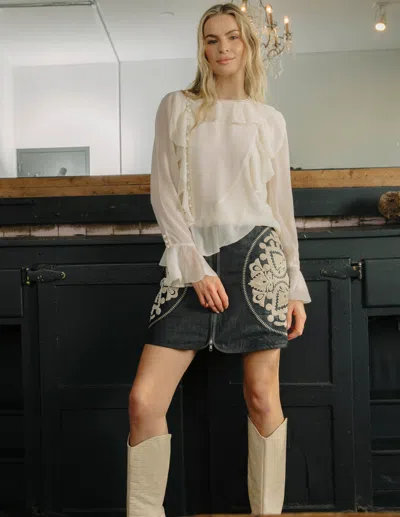 The Ayla Skirt is a standout piece featuring enlarged velvet ivory applique that adds a modern artisanal touch to a classic silhouette. With its front zip closure and flattering fit the Ayla Skirt transitions seamlessly from daywear to evening style.