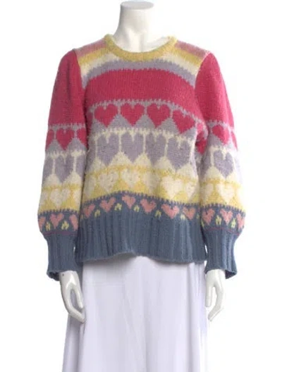 Love Shack Fancy Pullover Blue, Pink & Yellow Printed Embroidered Accent Long Sleeve with Crew Neck Designer Fit: Sweaters by Love Shack Fancy typically fit true to size. | LoveShackFancy Printed Crew Neck Sweater in Blue/Pink/Yellow, Women's S