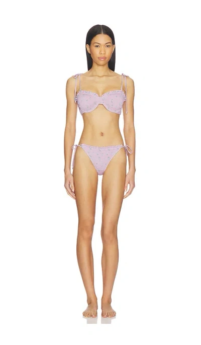 LoveShackFancy Quinley Bikini in Purple. - size L (also in M, S, XL, XS, XXS) LoveShackFancy Quinley Bikini in Purple. - size L (also in M, S, XL, XS, XXS) 85% polyester 15% spandex. Made in China. Hand wash. Underwire cups with removable padding. Top has self-tie straps with gold-tone S-hook back closure. Swimwear fabric. Bottoms have self-tie side closures. Sold as a set. LESH-WX85. LW160-3023. LoveShackFancy is a collection of hand-dyed and printed silk dresses and separates. It embodies a lux bohemian lifestyle with whimsical pieces that can take you from the beaches of Tulum to an elegant dinner party in NYC.