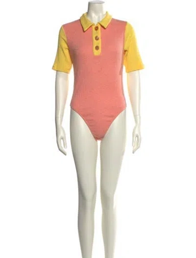 Love Shack Fancy Bodysuit Pink & Yellow Short Sleeve with Collar Button Closure at Front Fit: Tops by Love Shack Fancy typically fit true to size. | LoveShackFancy Short Sleeve Bodysuit in Pink/Yellow, Women's M