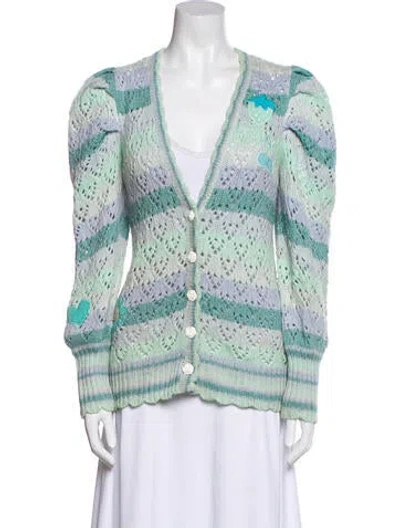 Love Shack Fancy Cardigan Blue & Green Striped Scalloped, Crochet & Embroidered Accents Long Sleeve with V-Neck Button Closure at Front Designer Fit: Sweaters by Love Shack Fancy typically fit true to size. | LoveShackFancy Striped V-Neck Sweater in Blue/Green, Women's XS