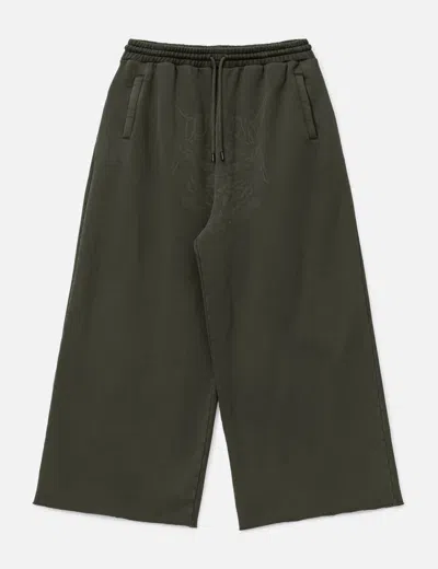 LUU DAN Raw-cut Bontan Heavyweight sweatpants Oversized Elastic waistband with drawstring Two front pockets Single rear patch pocket Overdyed and frayed at the hem Laser-cut graphic on front Color: Dark Fog