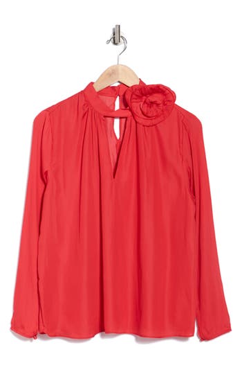 Pair this with your favorite jeans and slides for your next girls night out.Elevate your wardrobe with the Lucy Paris Leighton High Neck Top, featuring long sleeves and a sophisticated mockneck design in a striking red color. This blouse stands out with a unique side flower accent, combining classic elegance with a modern twist. Closure - Button closure. Care - Machine wash and hang to dry. Perfectly versatile, this top is an ideal choice for both day and night occasions.