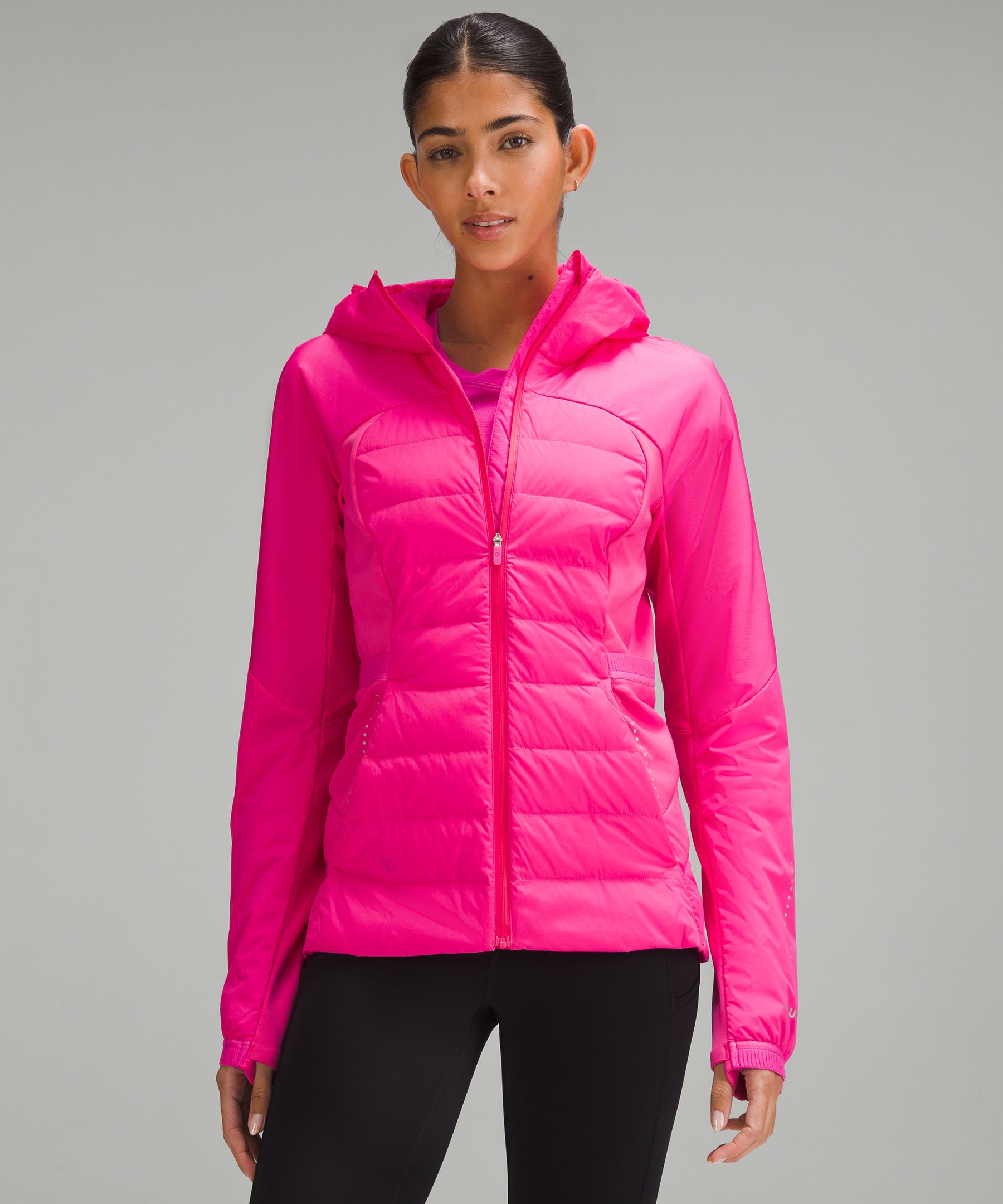 This jacket is fully loaded for running in cold weather. Zoned insulation holds warmth where you need it and stretchy fleece keeps you moving freely. Designed for Running. Mid warmth is designed with zoned RDS Down and PrimaLoft insulation to regulate body temperature. Zippered exterior pockets with a hidden phone sleeve. Thumbholes. Reflective details. Slim fit skims your body. Hip length.
