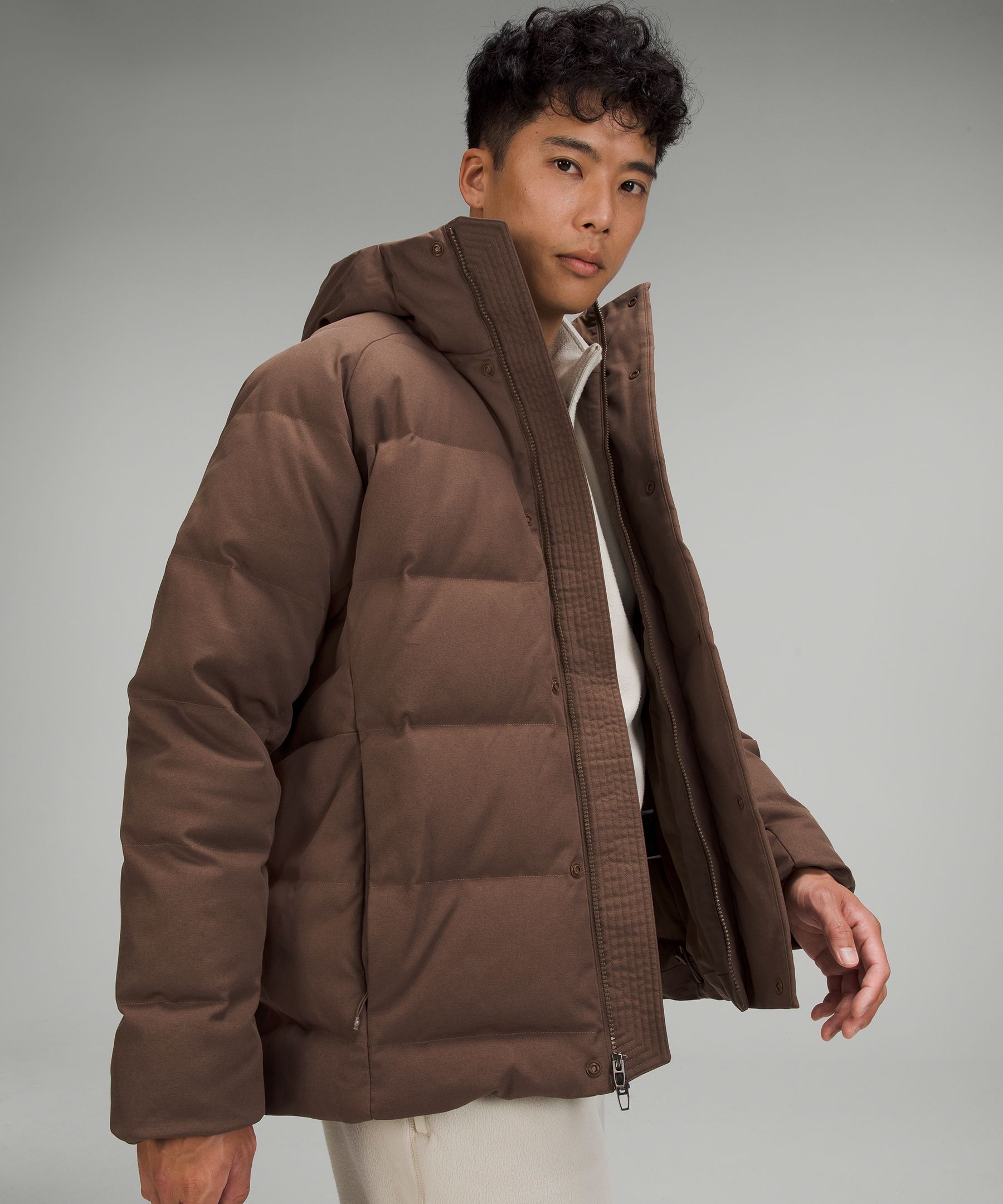Peak cold-weather comfort has arrived. Take winter by storm in this wonderfully warm puffer jacket insulated with plush channels of 600-fill-power down. Designed for On the Move. Relaxed fit feels roomy and can be worn over larger layers. Size down if you prefer a slimmer fit. Zippered exterior pockets with a hidden phone sleeve. Multiple pockets on the inside for small essentials. Close-fitting hood helps lock in heat. Close-fitting internal cuffs. Water-Resistant, Technical Canvas Fabric. Knuckle side pocket: 100% Recycled polyester. Collarand cuff: 57% Nylon, 24% Polyester, 19% Lycra elastane. Trim filling: 80% Recycled polyester, 20% Polyester. Inner layer lining: 100% Recycled polyester. Mesh: 89% Nylon, 11% Elastane. Filling: 80% Grey goose down, 20% Grey Goose Feathers. Lining: 100% Recycled polyester. Body: 76% Polyester, 24% Elastomultiester.