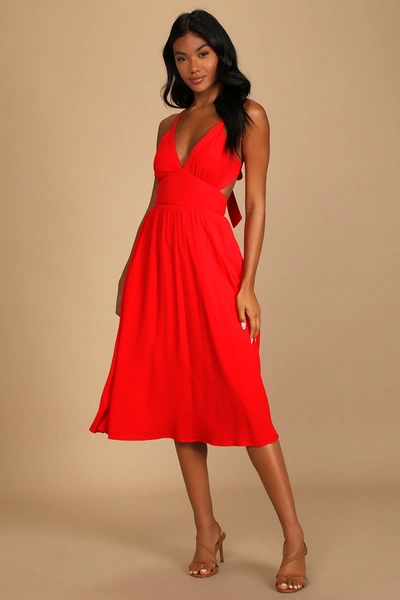 LULUS Bold New Look Bright Red Tie-back Midi Dress With Pockets