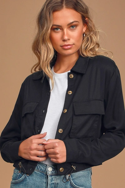 Lulus Exclusive! Functional yet fashionable is what the Lulus Eldora Black Cropped Utility Jacket is all about! Lightweight, woven twill shapes this versatile jacket with a collared neckline and long sleeves with button cuffs. The relaxed bodice features two patch pockets, a full button placket, and an elasticized, cropped hem with adjustable drawstring pulls. Fit: This garment fits true to size. Length: Size small measures 19" from shoulder to hem. Bust: Great for any cup size. Waist: Fitted - elastic waist allows stretch. Undergarments: May be worn with any standard bra. Fabric: Fabric has no stretch. Unlined. 100% Tencel. Hand Wash Cold. Do Not Bleach. Line Dry. Iron Low Heat. Imported. Lulus | Eldora Black Cropped Utility Jacket | Size Large.