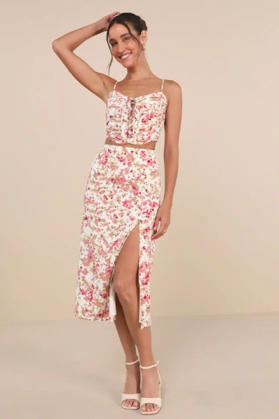 Instantly become a pro at impressing everyone with your incredible sense of style, thanks to the Lulus Mastered Elegance Ivory Multi Abstract Print Midi Skirt! Sleek satin-y woven fabric shapes this sweet skirt that boasts an eye-catching, pink and green abstract print across the chic column silhouette. A high-waisted fit, modern midi hem, and flirty side seam slit complete the compliment-worthy look. Hidden back zipper/clasp. Fit: This garment fits true to size. Length: Mid-calf length. Waist: Fitted - very fitted at natural waist. Hip: Loosely Fitted. Fabric: Fabric has no stretch. Lined. Shell: 100% Polyester. Lining: 100% Polyester. Hand Wash Cold. Do Not Bleach. Line Dry. Iron Low Heat. Imported. Lulus | Mastered Elegance Ivory Multi Abstract Print Midi Skirt | Size Medium | 100% Polyester.