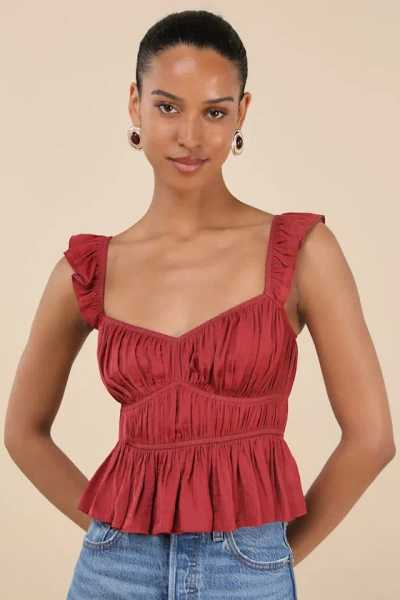 The sweetest touch to any OOTD, this sleek tank top features darling, fluttery straps that frame the flattering sweetheart neckline. Elastic tiers create a gathered effect and a set-in-style waist that tops a slightly cropped, flouncy peplum hem. Fit: This garment fits true to size. Length: Size medium measures 12.50" from top to bottom. Bust: Works best for A to C cup sizes. Waist: Fitted - elastic waist allows stretch. Undergarments: May be worn with a strapless bra, adhesive bra, petals, or no bra. Fabric: Fabric has no stretch. Unlined. 100% Polyester. Hand Wash Cold. Do Not Bleach. Line Dry. Iron Low Heat. Imported. Lulus | Sanne Rust Red Flutter Sleeve Tank Top | Size Small | 100% Polyester.
