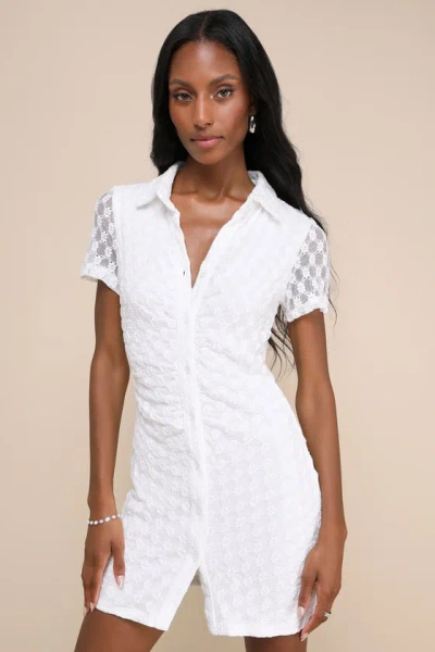 LULUS Truly Pristine White Mesh Floral Ruched Button-up Mini Dress