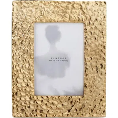 Our Santorini Frames with their wide profile and textured gold are an elegant and glamorous option for putting your favorite memories on display.Each of our creations is designed in our San Francisco studio. Master craftsmen using centuries old technique of sand casting create the original mould and skilled artisans hand create every piece, with pride, in our family owned factory. DetailsDimensions : 4x6:Size: 1" H; 9" L; 7.2" WFinish: Goldplate5x7:Size: 1" H; 10" L; 8.5" WFinish: Goldplate8x10:Size: 1" H; 12.9" L; 11" WFinish : GoldMaterial : AluminumUse and CareGiven its handmade and hand-finished nature, variations in the piece are to be expected and celebrated.No two pieces are exactly alike.Hand wash with mild soap, water, and towel dry.Do not use abrasives or chemicals to clean as the metal may scratch and discolor.