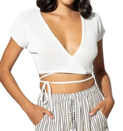 Pair this crop top with your favorite high-waisted jeans or maxi skirt.Elevate your wardrobe with the Jules Top by LUSANA, a chic cropped wrap style designed for contemporary flair in textured white. This top features cap sleeves, a V-neck, and an adjustable long tie closure for versatile styling. Composition - 100% Cotton. Care - Hand wash cold, lay flat to dry.