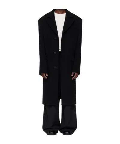 Melton coat with peak lapels, a button closure at the front, welt pockets, flap pockets, padded shoulders, a central vent at the back hem, internal welt pockets, and a patterned woven satin lining.