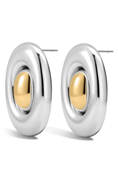 Pillowy frames orbit gleaming domes on these two-tone oval stud earrings boasting a high-shine finish. 25mmW x 33mmL Post back Brass/silvertone plate/goldtone plate Imported