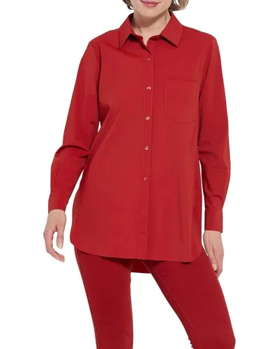 A classic button down shirt that will never go out of style.Experience elegance with the Schiffer Button Down by Lysse in stunning Matte Red. This women's shirt is skillfully crafted from a 75% nylon, 25% spandex blend, offering a sleek, sophisticated look with its 4-way stretch microfiber. Features include a classic collared neckline, long sleeves with buttoned cuffs, a patch pocket on the left chest, and a distinctive rounded raw-cut high-low hem. A practical choice, this shirt comes with a front-button closure and is imported, requiring simple care with machine wash cold and line dry instructions.