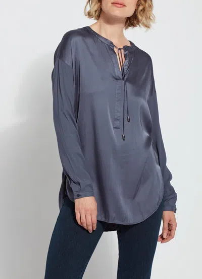 The Terra Reverse Pullover Top is a legging-friendly women’s shirt featuring an oversized fit, drop shoulders, front drawstring with metallic stoppers, and a rounded, high-low hem. Crafted from EcoVeroâ„¢ Stretch Satin, an eco-friendly fabric that appears shiny on one side and matte on the other, it offers 2-way strech and easy care. This legging-friendly women’s shirt offers a shiny satin body with matte satin sleeves, front placket and collar band. The Terra Reverse Pullover Top perfectly partners with leggings and booties. Upon delivery steam to remove wrinkles.  Eco-friendly 2-way stretch EcoVero Strech Satin- 53% Rayon, 44% EcoVero, 3% Spandex Oversized; size down for smaller fit Model is 5’10â€, wearing size SÂ