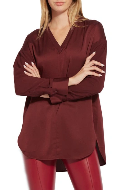 The Token Pull over Top is an oversized, legging-friendly blouse crafted from luxe, easy-care Satin. Combining shiny and matte Satin, the Token Pull Over Top showcases drop shoulders, cross-front V-neck, center front seam, back yoke with double pleat, and high-low, legging-friendly hem. Partner this Satin top with our Elysse Wide Leg and Kiara Vegan Suede Blazer for sleek, sporty look. Upon delivery steam to remove wrinkles. Satin- 100% Polyester Oversized; size down for smaller fit Model is 5’10â€, wearing size S Style number - 2889