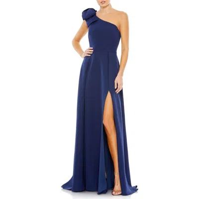 MAC DUGGAL Sleeveless Crepe Dress With Statement Bow And Thigh-high Slit In Blue