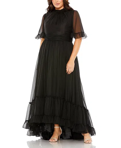MAC DUGGAL High Neck Flutter Sleeve Ruffle Tiered High Low Plus Size Gown In Black