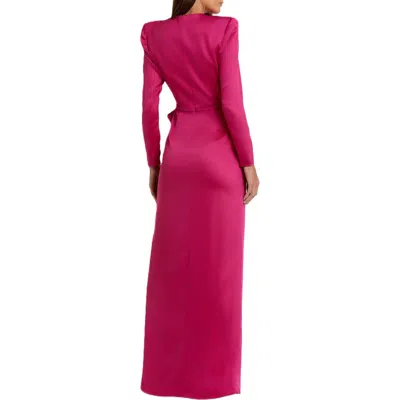 This elegant gown features long sleeves for a refined look, while a structured bow adds modern glamour. The expertly draped silhouette creates a graceful, flowing effect, perfect for formal events. Approx. 60" from top of shoulder to bottom hem Concealed back zipper High neckline Long sleeve Lined