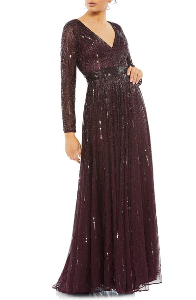MAC DUGGAL Sequin & Bead Stripe Long Sleeve Mesh Gown In Mulberry
