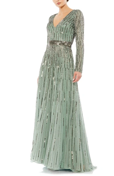 MAC DUGGAL Sequin & Bead Stripe Long Sleeve Mesh Gown In Sage