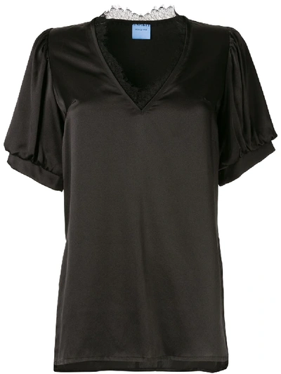 Black silk Shadow blouse from MacGraw featuring a lace detail, a v-neck, short sleeves and a straight hem.