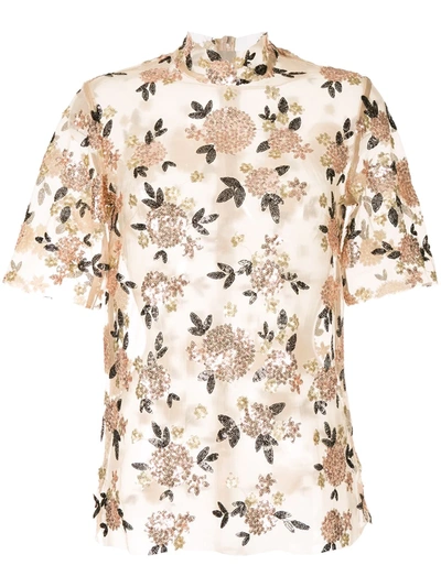 Gold-tone sheer shell top from MacGraw featuring a high standing collar, a sheer construction, a floral pattern, sequin embroidery, short sleeves, a rear zip fastening and a straight hem.